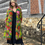 Luxurious multicolor faux fur jacket - faux long hair goat fur coat with belt - perfect disco era outfit pairing. Exaggerated collar, satin lining and front pockets. Measurements below are taken from the front of coat laying flat: