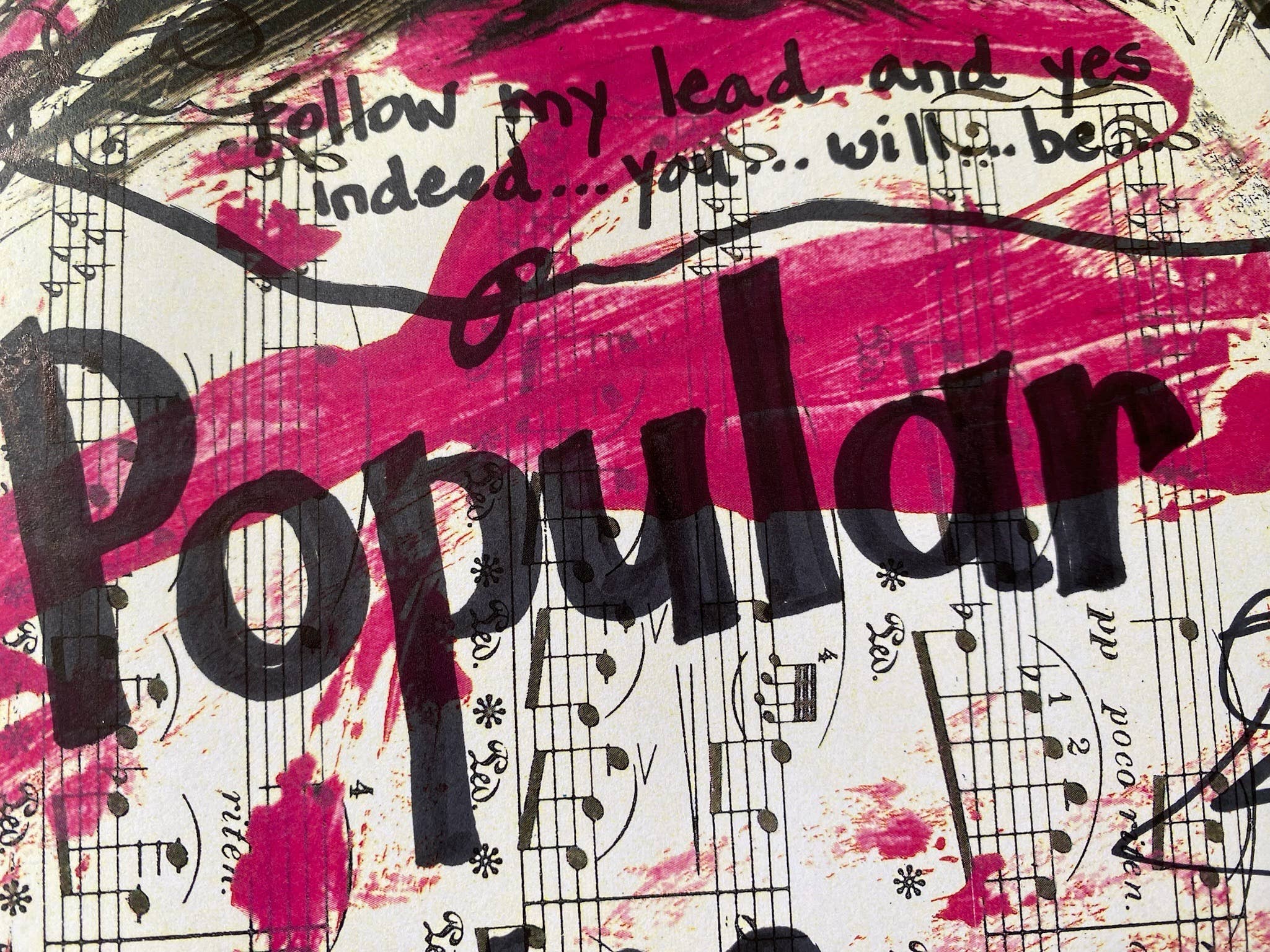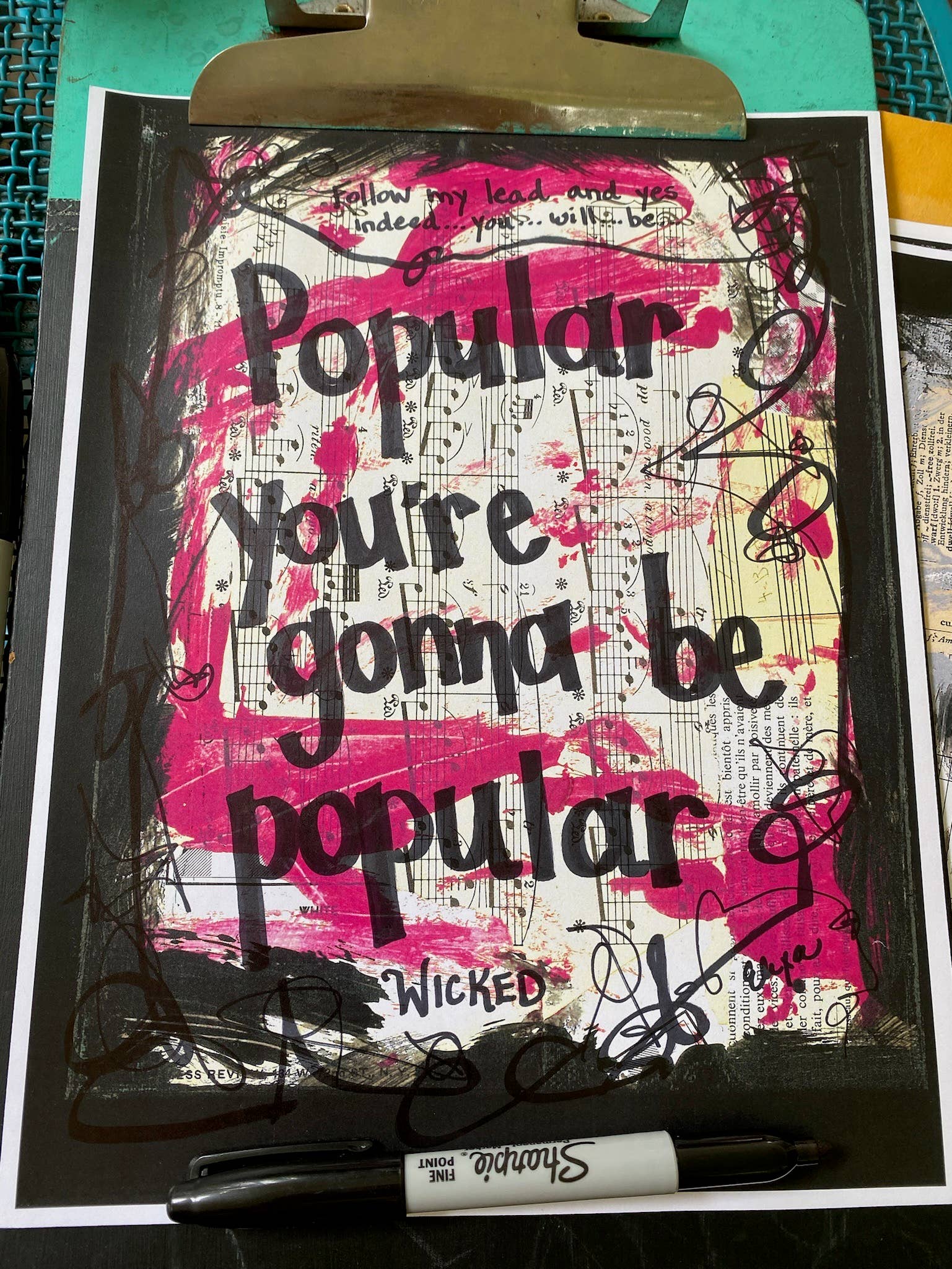 "Popular" is inspired by the Broadway musical and movie Wicked. The original painting shown in the pictures uses sheet music, vintage book pages, acrylic paints, and black sharpie.