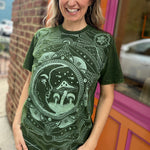 Relax in effortless boho vibes with the Green Moon Mushroom Stonewashed T-shirt. Crafted from 100% cotton, this comfy tee feels soft against your skin while adding a fun twist to your wardrobe.