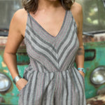 Be cozy and light with the Grey Striped Palazzo Cotton Jumpsuit. Perfect for those warmer months, this jumpsuit keeps you stylish and cool no matter where you are. Wear this universal piece when shopping or giving your favorite coffee shop a visit!