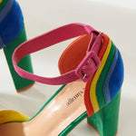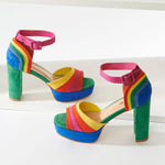 Bring a pop of color and joy to every step with our Rainbow Suede Peep Toe Pumps. Designed in an overlay of all the vibrant rainbow shades, these playful high heels are the ultimate statement shoe for festivals, parties, and bold everyday looks.