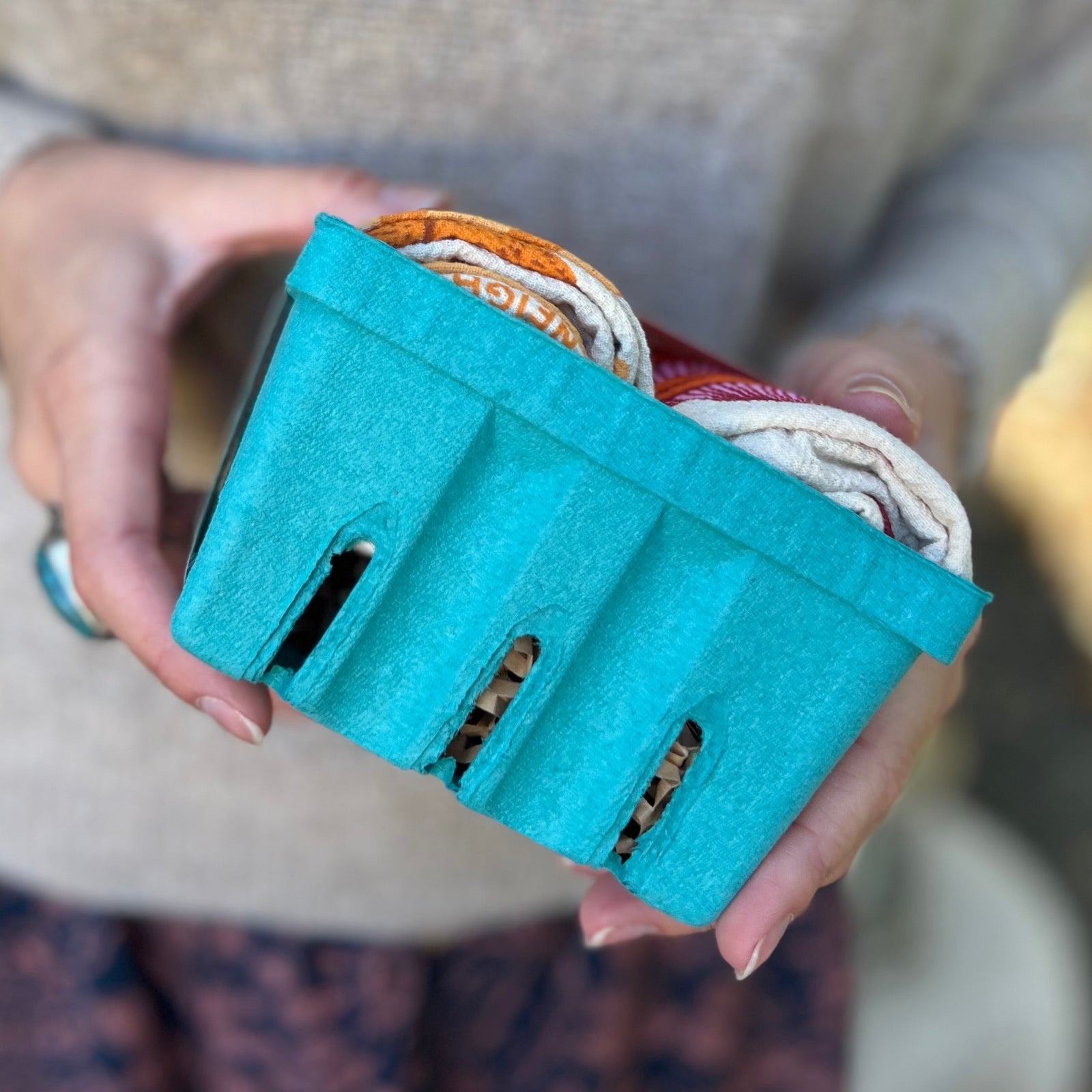 Crafted from unbleached 100% cotton and screen-printed with eco-friendly water-based inks, these tea towels are durable and machine washable. This set includes two towels measuring approximately 24 inches by 26 inches and featuring a sunflower design and a marigold design. Both towels are in a compostable quart produce container.