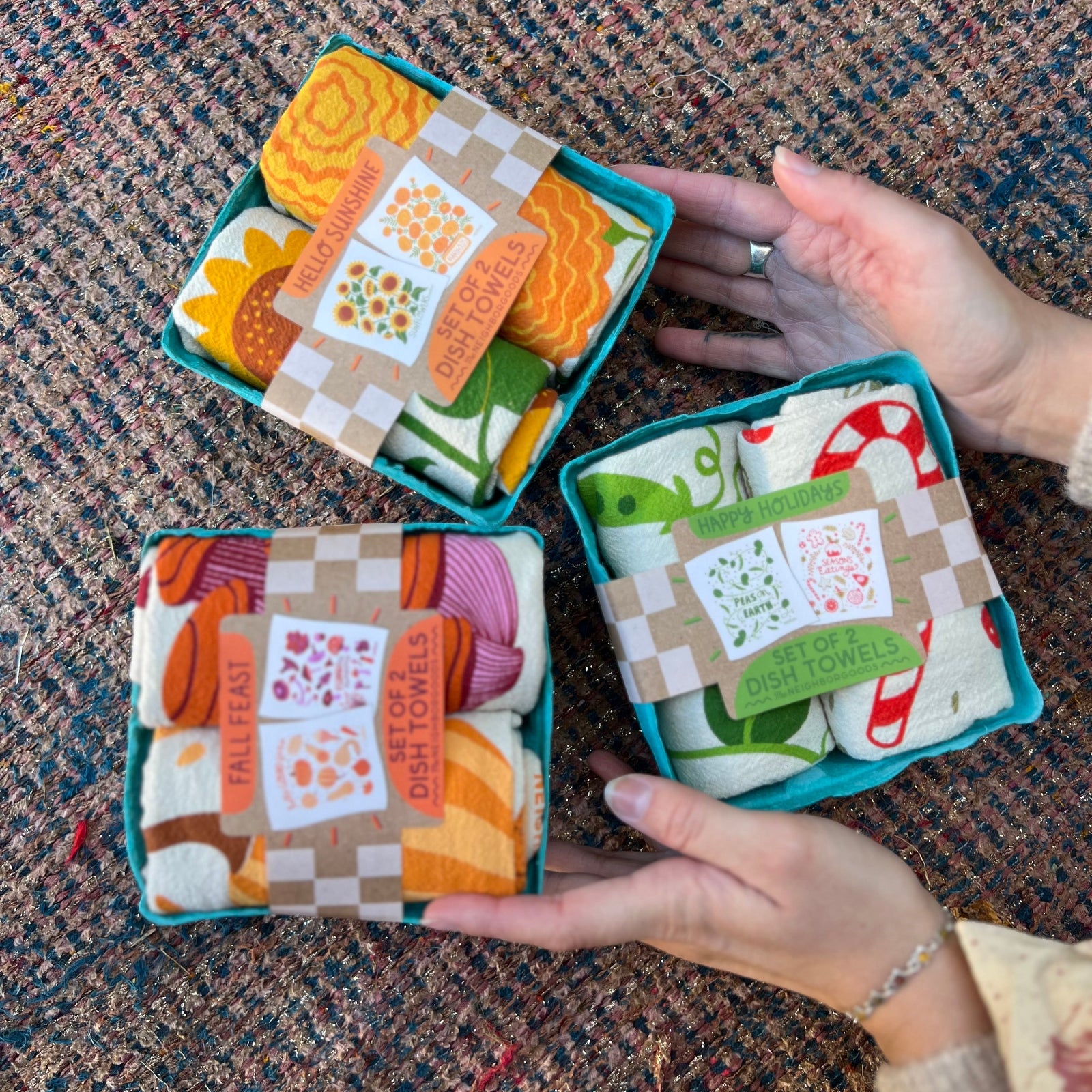 - Set includes 2 tea towels with a sunflower and marigold design in a 5.5" x 5.5" x 3" quart produce container
