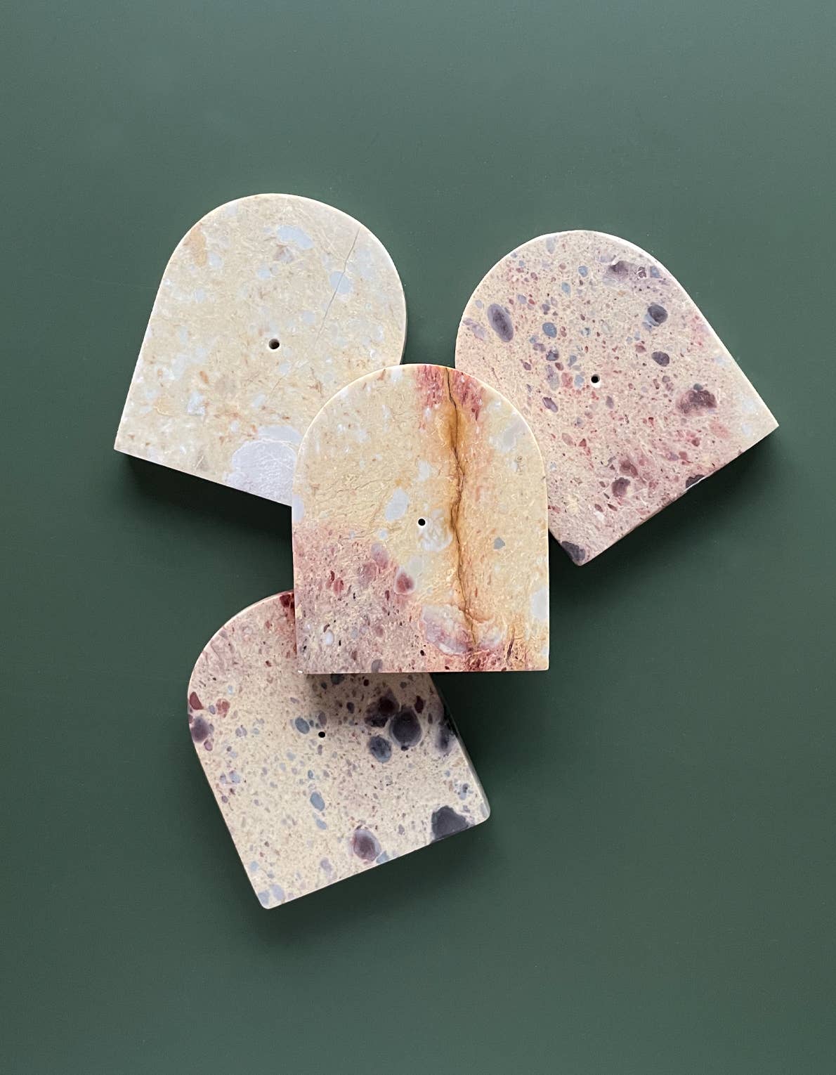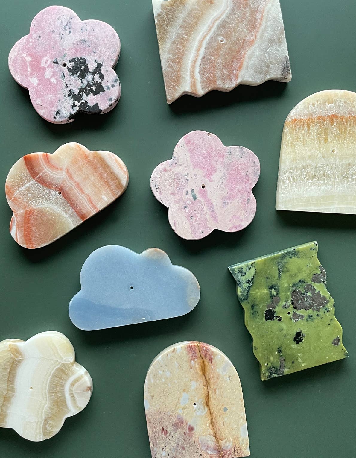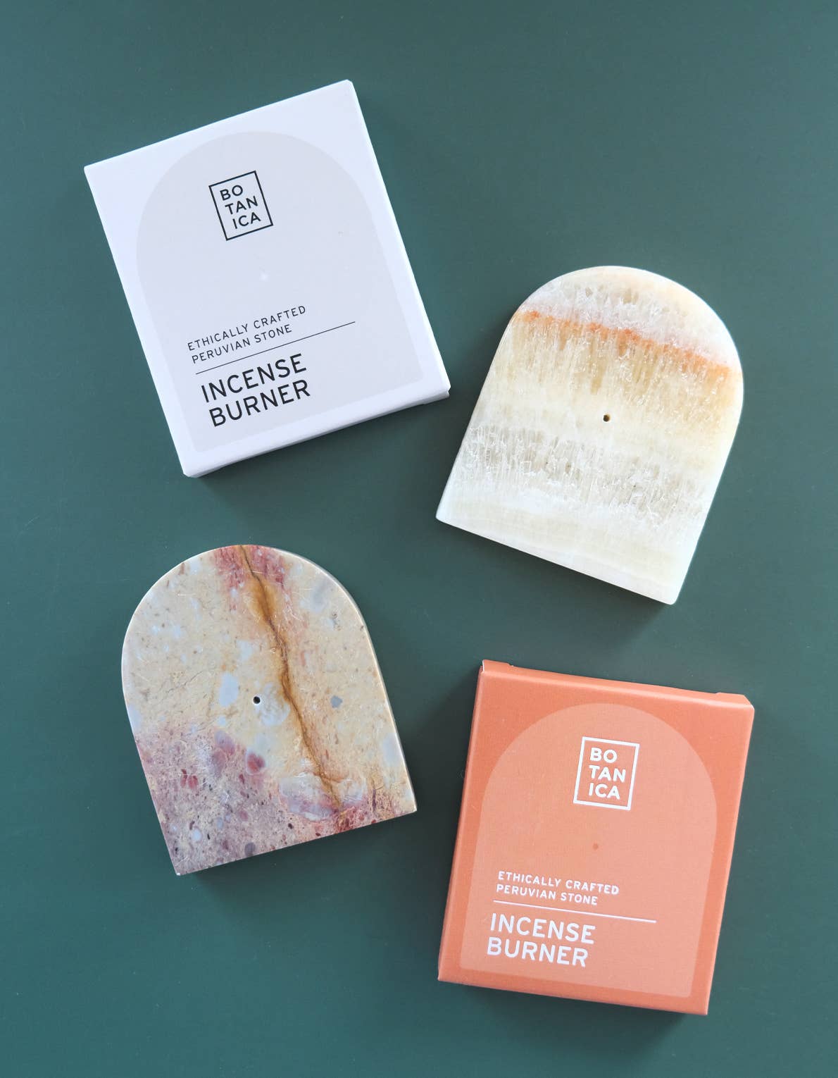 Our incense holders are hand-carved from natural stone by Peruvian artisans, and certified ethically hand-crafted by NEST. No two are exactly alike–color and veining differences will be apparent on each unique piece.