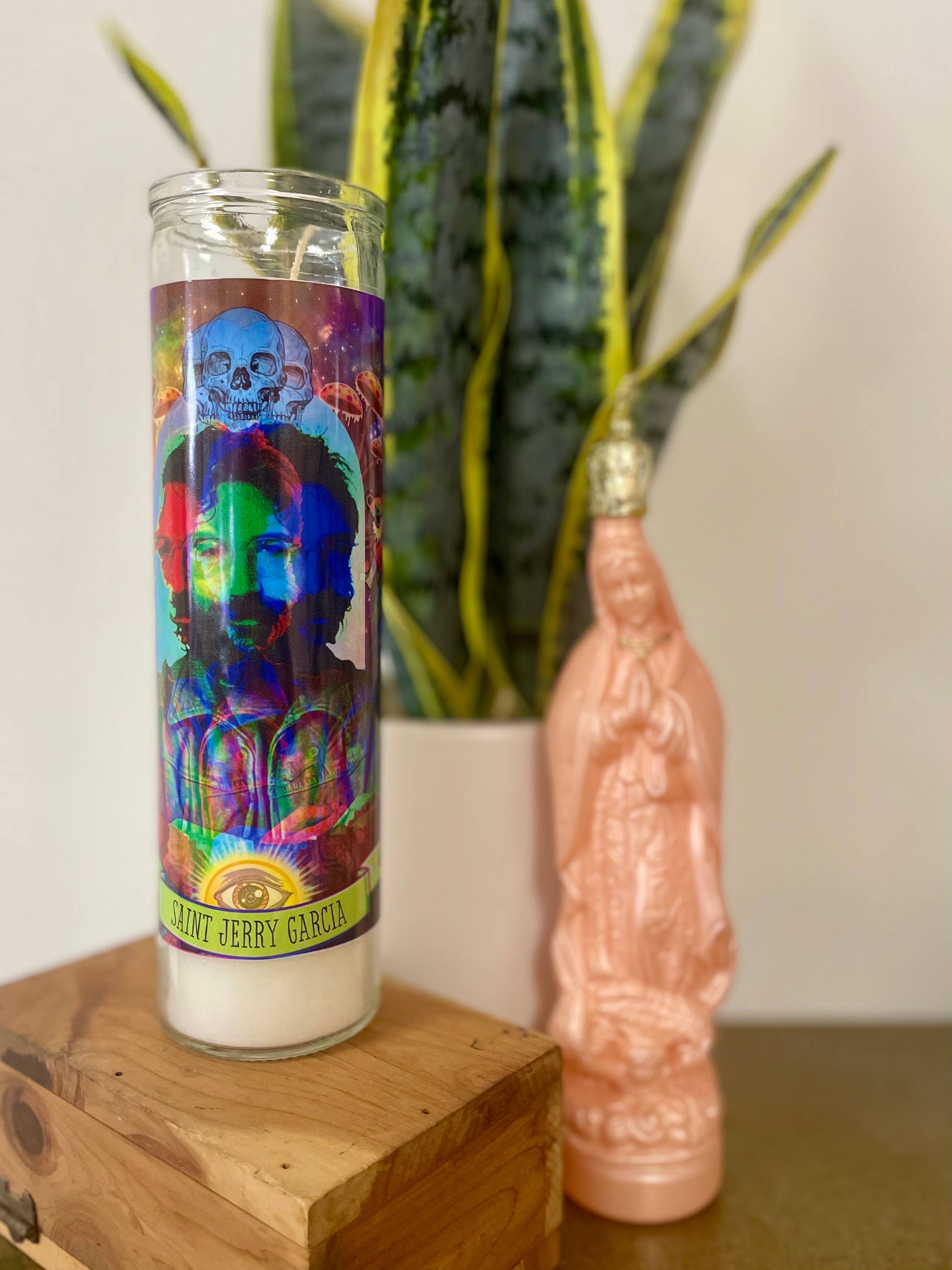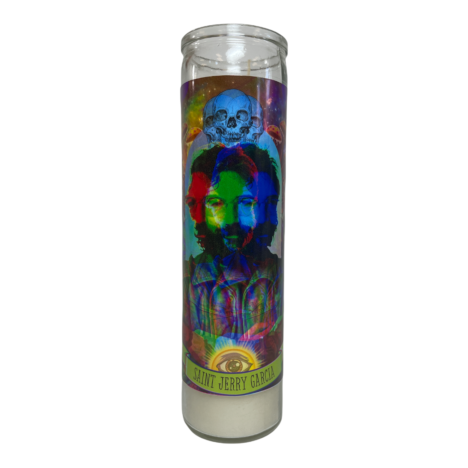The Luminary Jerry Garcia Altar Candle Tall white altar/ prayer candle featuring the Patron Saint of Dead Heads.