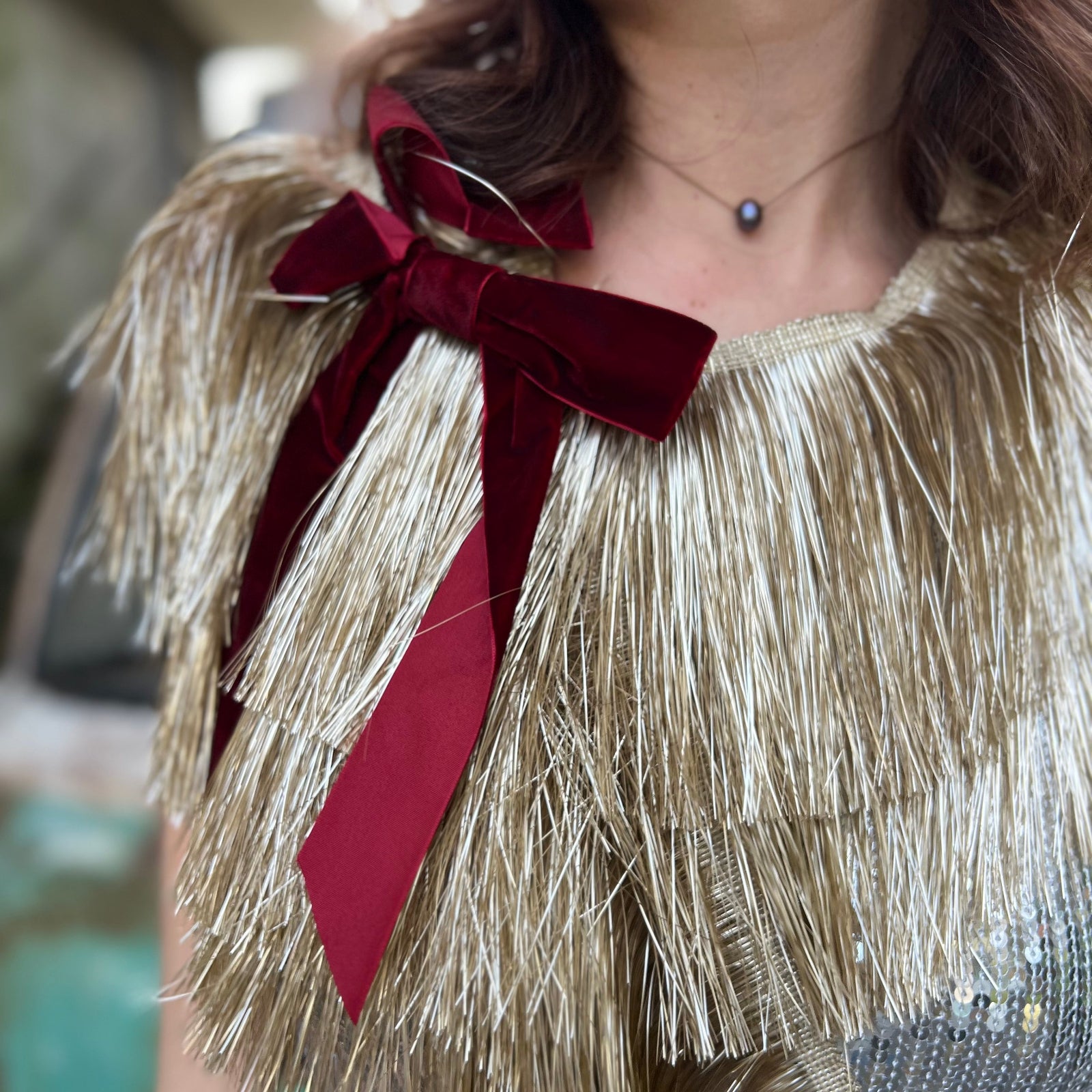 Someone wearing the Gilded Bow Gold Layered Fringe Banner in front of a vintage teal Volkswagen bus.