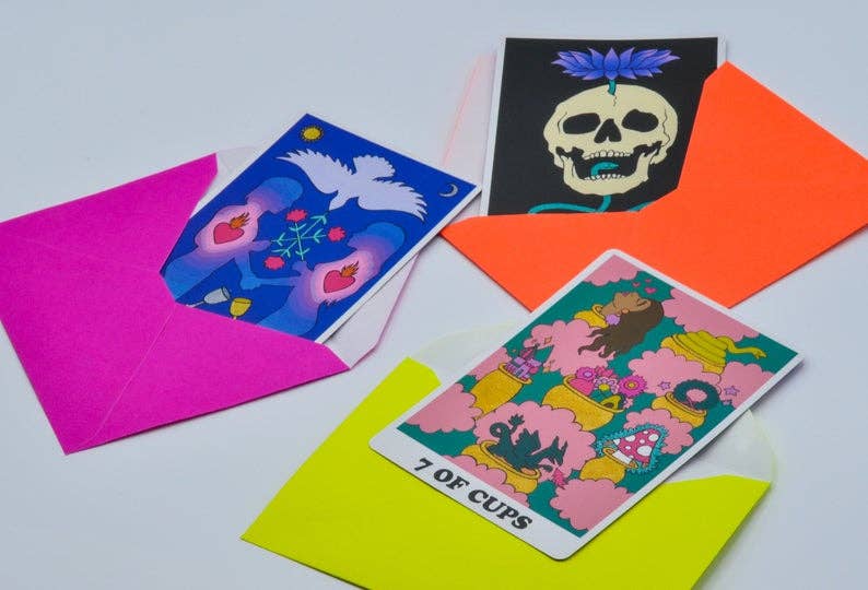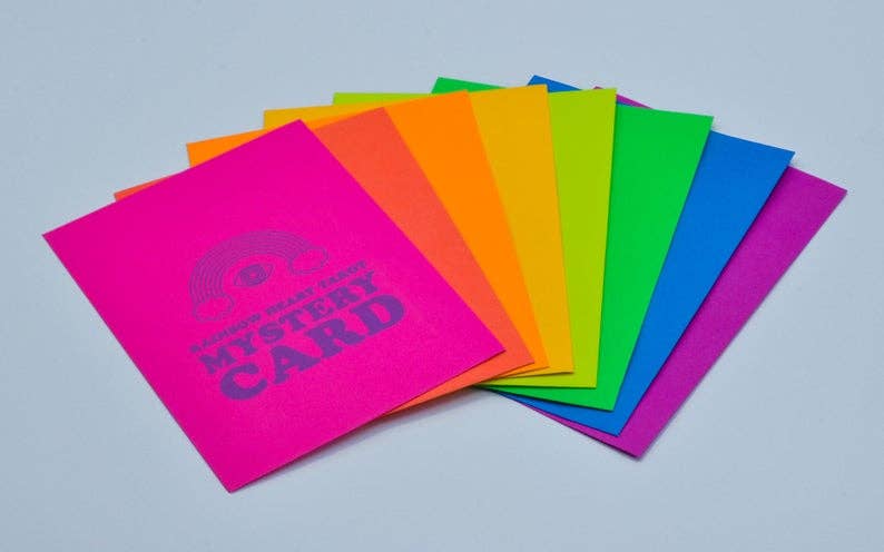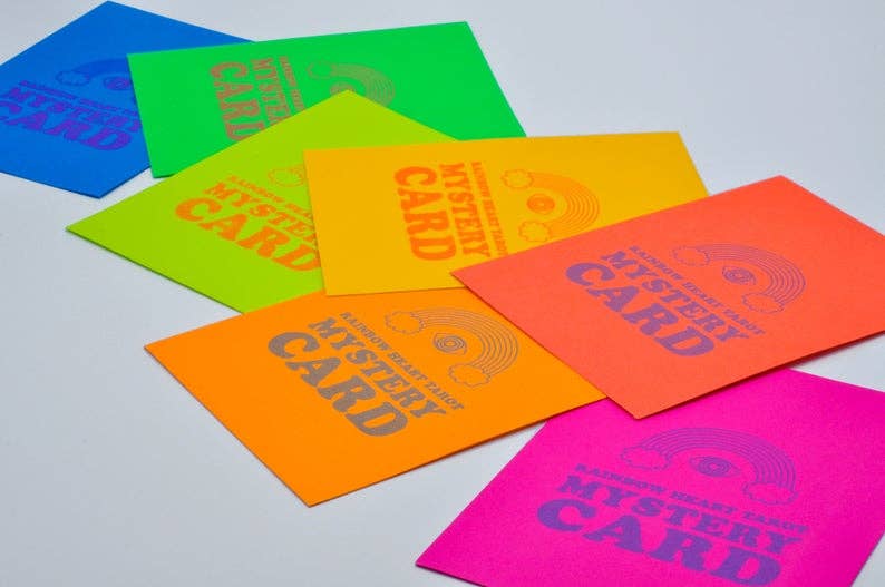 A single mystery card from the Rainbow Heart Tarot pulled from the deck at random. Each card comes in a 4x5.5" hand-stamped fluorescent envelope. Perfect for intention-setting, Birthdays, Saturn Returns and other special occasions.