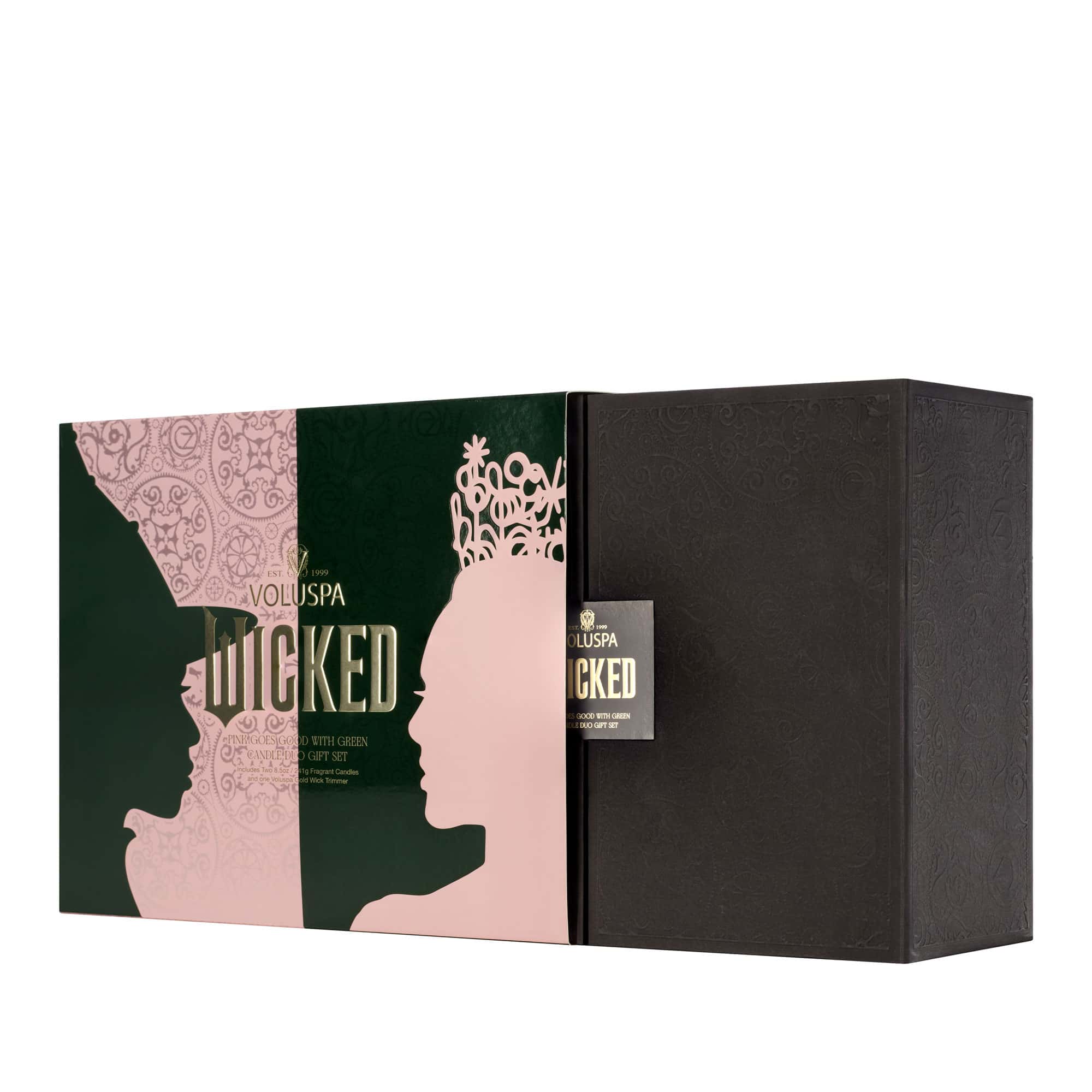 Uncover the aromatic tale of two opposites that attract. With Glinda’s Perfectly Pink Yuzu Candle, Elphaba’s Bewitching Banyan Forest Candle. This set includes two 8.5 oz candles packaged in an extravagantly decorated box, complete with a gold-plated wick trimmer.