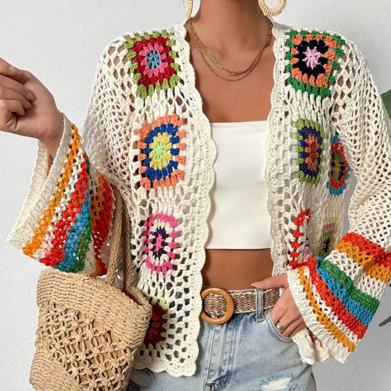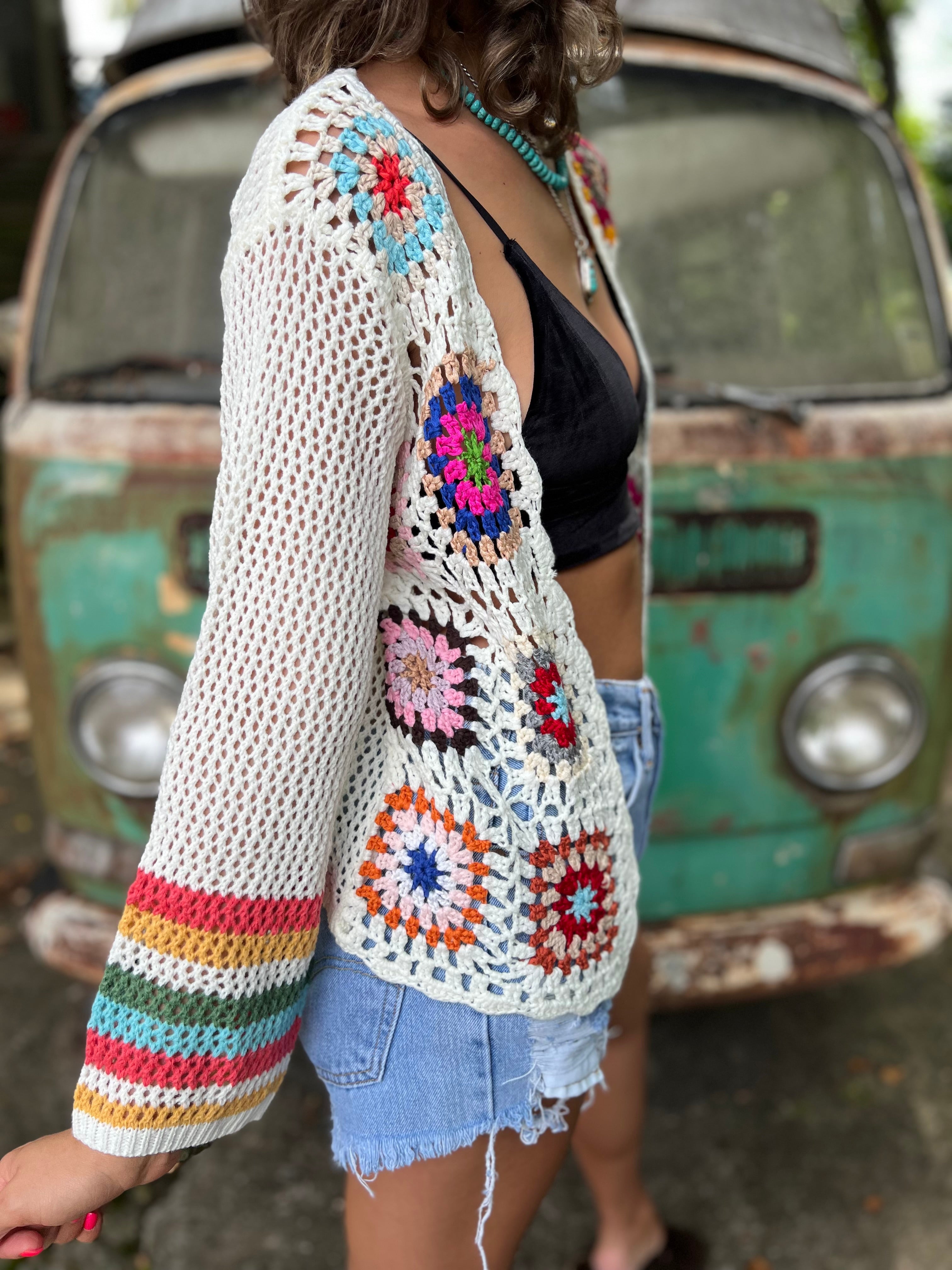Wrap yourself in sunshine and good vibes with this playful rainbow crochet cardigan. A joyful, free-spirited essential for any bohemian wardrobe.