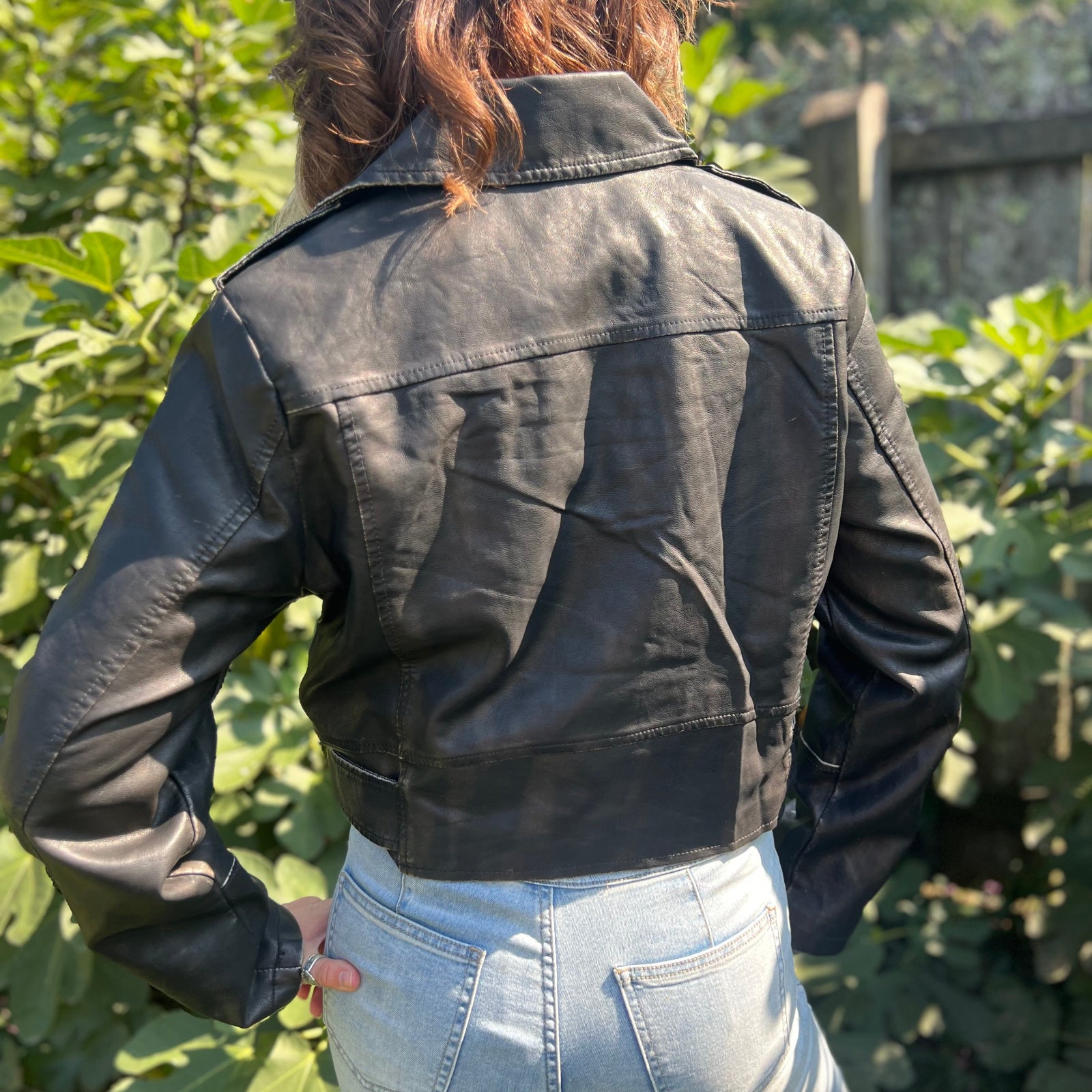 Gear up for the weekend in this edgy washed black leather moto jacket, highlighted by timeless silvertone accents. Stay cozy, stylish, and effortlessly cool no matter where your adventures take you with this standout piece!