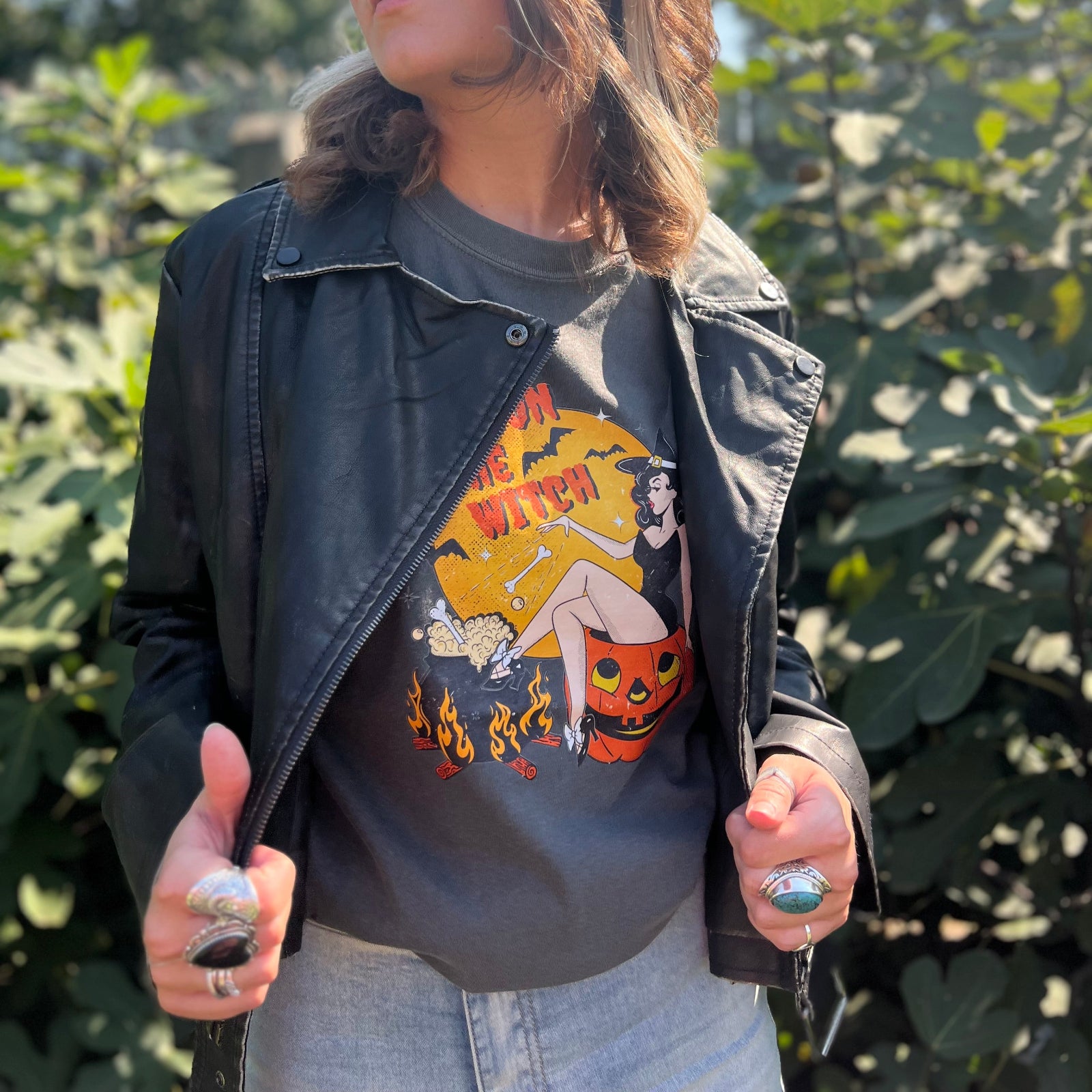 A woman wearing the Washed Black Leather Moto Jacket with jeans in front of some greenery.