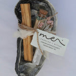 Ignite this precious wood with our match vessel and striker and you will experience a synergy of balance and clarity in your space. This thoughtfully packaged ritual includes a locally found North Carolina oyster shell, which serves a dual purpose as both a holder for your Palo Santo and a dish for safely burning it.
