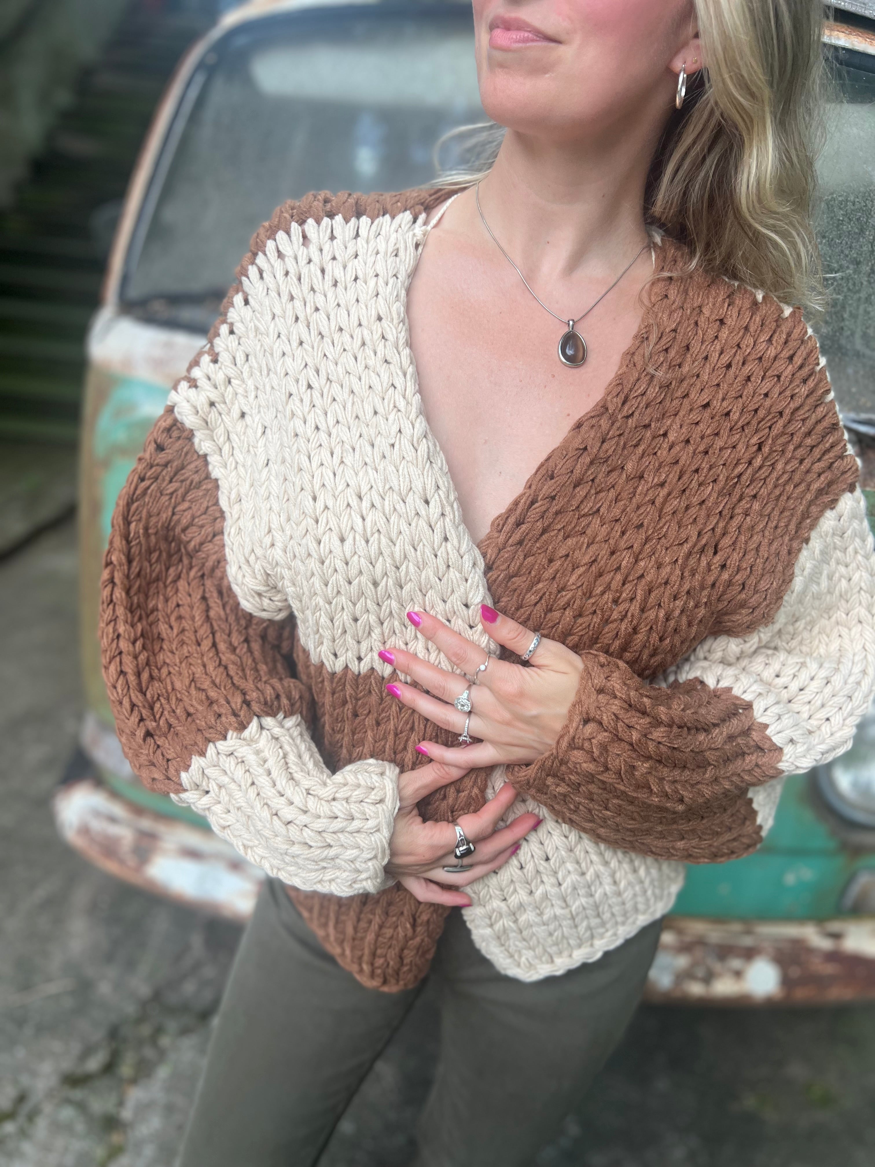 Let’s get cozy and warm in the cream and brown color block chunky knit cardigan. This adorable cardigan is a perfect addition to your fall and winter closet, ready to add some warmth and style to any outfit. Whether you’re going for a western vibe or an indoorsy aesthetic, this cardigan can do both!